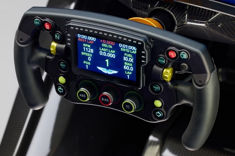 The Aston Martin x Curv AMR-C01-R has a built-in racing wheel styled like the ones you see on Formula race cars. That means, it comes with integrated paddle shift and clutch, along with nine rotary dials and 12 push buttons scattered all over its surface. In the center of the steering wheel is a full-color LCD that displays a variety of relevant stats, so you can have all important information right in front of you. According to the outfit, they pair the wheel with a high-torque steering motor with precision feedback, although they’re not saying which make and model it’s built off on. It also gets an electronically-controlled sliding pedal box with 200mm of travel, all powered by an electric actuator inside a carbon fiber enclosure.